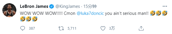詹姆斯发推写道:哇哇哇!!!得了吧卢卡,你不是认真投的吧!(6个笑哭表情)