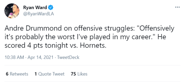 来源:直播车04-14 20:21直播车讯 北京时间4月14日,湖人101-93击败黄蜂,德拉蒙德出战24分钟,7投2中,得到4分12篮板1助攻3抢断2失误4犯规。他在进攻端的表现依然不佳,加盟湖人以来,庄神40投18中,命中率只有45%。赛后,德拉蒙德在采访中说道:“这很可能是我生涯里进攻最差的一季。”