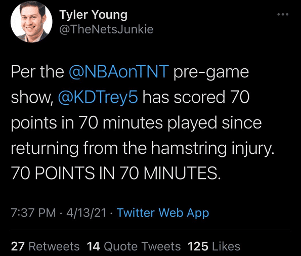根据美国记者的消息显示,杜兰特在腿筋拉伤复出之后一共出战了70分钟,砍下了70分,效率惊人。