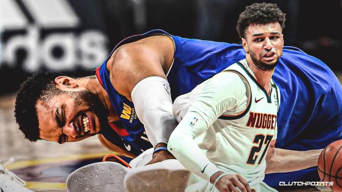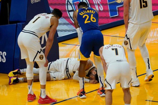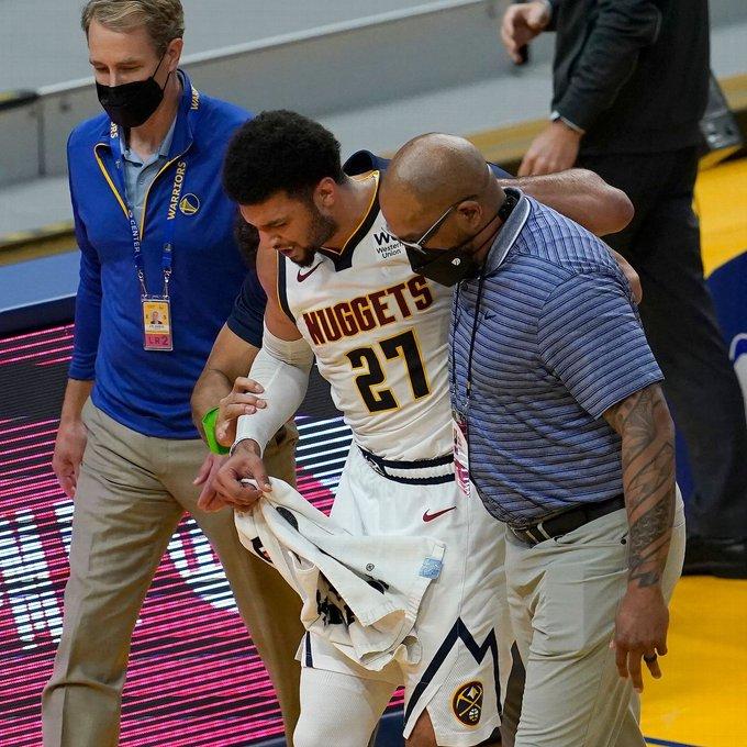 终场前50多秒穆雷持球反击,快攻中不幸扭伤膝盖,无接触痛苦倒地,24岁穆雷捂着膝盖十分痛苦,痛得捶打地板,约基奇一直站在穆雷身旁安慰他;工作人员推过来轮椅,但穆雷拒绝坐轮椅离场,被两人搀扶抬出球场。
