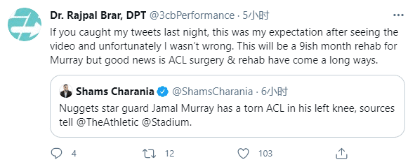 穆雷受伤后,掘金队留在旧金山过夜,一起等待穆雷的核磁结果,最终穆雷伤情确诊为左膝十字韧带撕裂;本赛季已经有多名球员惨遭韧带撕裂的重伤,据医学专家分析,穆雷将会有长达9个月的恢复期,至少伤停9个月,直接赛季报销。