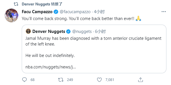 赛季至今,穆雷为掘金出战48场比赛,场均上场35.5分钟能够贡献21.2分4篮板4.8助攻,还有1.3次抢断;掘金34胜20负排在西部第四位,穆雷的受伤将会严重影响掘金的实力;约基奇打出生涯最好的赛季,有望冲击MVP,可穆雷惨遭大伤,不仅影响约基奇冲击MVP,而且让掘金的季后赛前景一片黯淡。