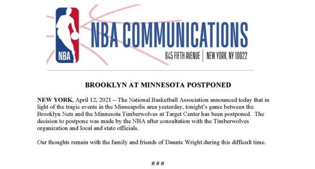 来源:直播车04-13 11:42直播车讯北京时间4月13日,NBA官方宣布,鉴于昨天在明尼阿波利斯地区发生的悲惨事件,今晚(当地时间)布鲁克林篮网队和明尼苏达森林狼队在标靶中心的比赛将推迟进行。比赛延期的决定,是NBA在征询森林狼队以及当地官员后做出的,在公告中,联盟还对当特-赖特的家人和朋友致以哀思。