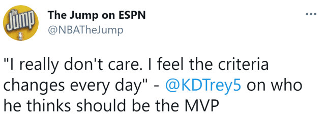 杜兰特也在今天接受了The Jump节目的采访,同样谈到了MVP的话题。被问到他认为谁该当选MVP时,杜兰特表示:“我真的不在乎。我觉得标准每一天都在变化。”