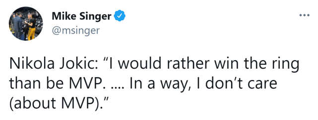 处于领跑位置的约基奇,在最近一次采访中谈到了MVP竞争。一位塞尔维亚记者问到了这个问题,约基奇的回答是:“如果这(当选MVP)发生了,当然会是一件了不起的大事。但是比起当选MVP,我更愿意赢得一个总冠军戒指。让我们看看吧,我也不知道。某种意义上来说,我不在乎(MVP)。”