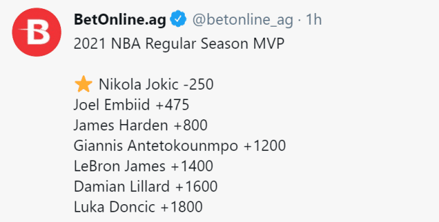 来源:直播车04-13 11:38直播车4月13日讯 北京时间4月13日,2021年常规赛MVP的最新赔率出炉,约基奇(-250)继续领跑,而且扩大了领先优势。恩比德(+475)排名第二,哈登(+800)位居第三。排名第4-7位的依次是字母哥(+1200)、詹姆斯(+1400)、利拉德(+1600)和东契奇(+1800)。