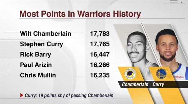 随着本场19分到手,库里常规赛总得分达到17784分,从而正式超越张伯伦(17783分)成为勇士队史得分第一人;与此同时,库里还超越巴里-豪厄尔(17770分)和兰尼-威尔肯斯(17772分)升到NBA历史得分榜第79位,连升两名杀进历史前80之列。
