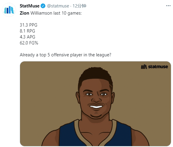 锡安连续两场得分35+,轰下38分投篮命中率高达72.7%,这是他本赛季第8次以70%(或以上)命中率砍下30+;据数据网站StatMuse统计,最近10场比赛,锡安场均轰下31.3分8.1篮板4.3助攻,投篮命中率为62.0%,并发问:他已经是联盟前五的进攻球员了吗?