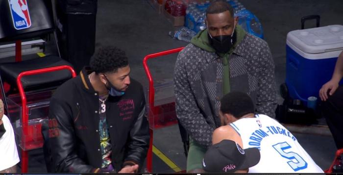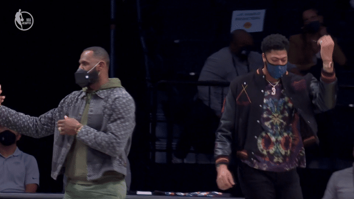 坐在替补席上观战的詹姆斯和浓眉看起来非常的开心,当塔克转身上篮打入漂亮的一球的时候,詹姆斯和浓眉甚至在场下不停地模仿,宛如过节一般庆祝。当塔克有些着急的时候,两位大哥还不停的在场边指导,塔克今天也得到了14分3篮板11助攻的好成绩,助攻数也创了赛季新高。