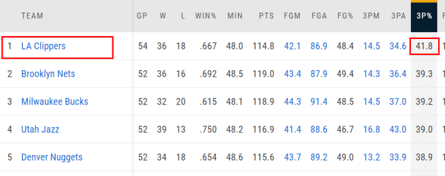 来源:直播车04-10 19:08直播车讯北京时间4月10日,快船主场126-109击败火箭。本场比赛,快船三分球37投19中,再次展露了外线的实力。赛季至今,快船的三分命中率达到41.8%,排名联盟第1,而且是唯一一支三分命中率超过四成的球队。