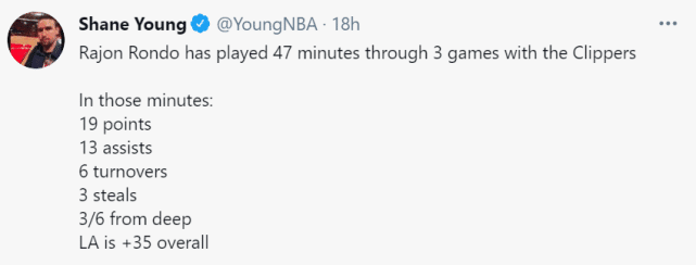名记肖恩-杨指出,朗多为快船出战的3场球,一共打了47分钟,在这47分钟里,朗多的数据是19分13助攻6失误3抢断,三分球6中3,在这47分钟里,快船赢了对手35分!