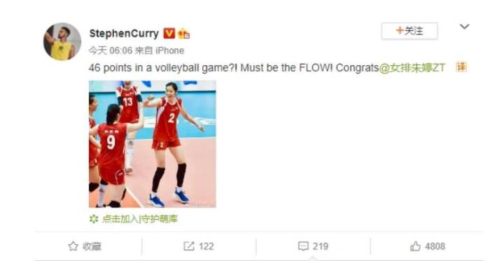 “46分?一定是进入了节奏,恭喜朱婷。”NBA巨星库里也在社交媒体上对朱婷发出来祝福,库里的跨界喊话让很多球迷奇怪,两者有什么联系?其实库里和朱婷算是同门师兄妹,因为两人都是安德玛旗下的代言人,这是其一,其二,优秀的人之间总是会互相欣赏,难道不是吗?