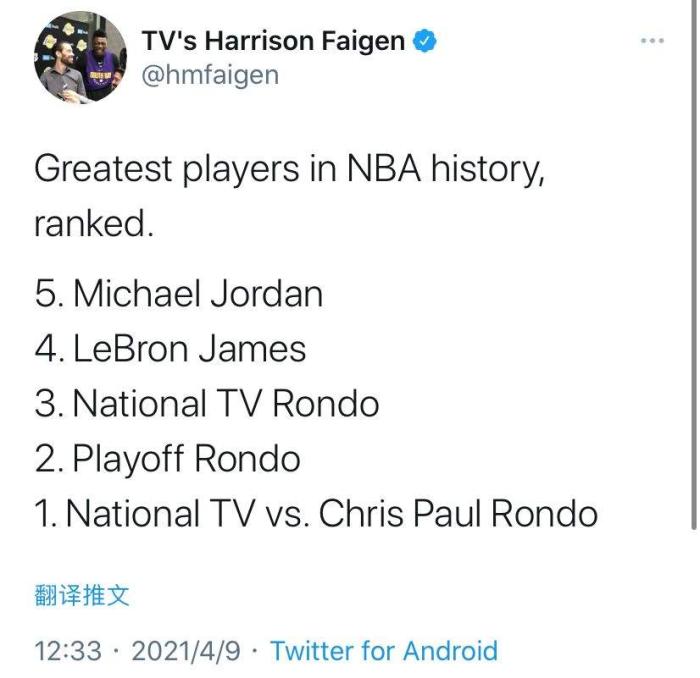 正是隆多这样出色的表现,在赛后也是赢得了洛杉矶记者的表扬和赞赏。其中湖人队的随队记者Faigen就发推特称赞了隆多的表现,不过这则推特是相当的有意思,他是排出了自己心目当中的历史前五位的球员,第五位是乔丹,第四位是詹姆斯,第三位则是全美直播的隆多,第二位是季后赛的隆多,第一位的则是全美直播打保罗的隆多。这样的排名是相当的具有趣味性,但是从一定程度也能够看出隆多这种球员是关键时刻的大心脏球员,同时他和保罗之间也绝对有着惺惺相惜的感觉。