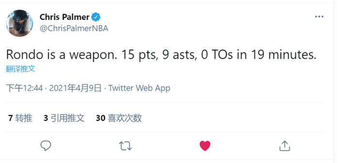 记者palmer:隆多是一件武器!只打了19分钟送出15分9助攻0失误!