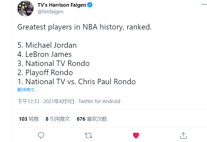 记者TV's Harrison Faigen搞笑调侃:历史上最伟大球员排名!第5乔丹,第4詹姆斯,第3全美直播时的隆多,第2季后赛隆多,第1全美直播对阵保罗的隆多!
