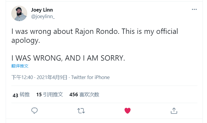 “我对隆多的言论错了!这是我正式道歉!我错了!对不起隆多!”