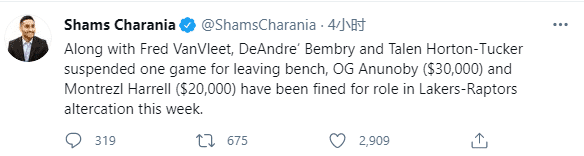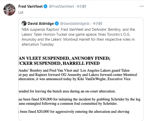 来源:直播车04-09 14:42直播车4月9日讯此前湖人和猛龙冲突处罚结果,据名记shams报道,阿奴诺比和哈雷尔被联盟追加罚款,合计5万美元;范弗利特、本布里和霍顿-塔克因离开板凳席被禁赛一场;两人被罚款以及三人被禁赛累计损失约17万美元,随后NBA官宣这一处罚结果,猛龙主力范乔丹发推回应此事。