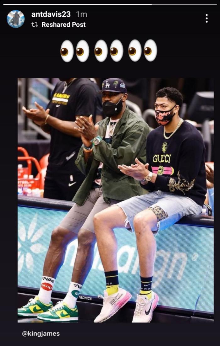 浓眉转发合影并且在合影上配上三双眼睛的表情,言外之意就是浓眉回应詹姆斯,表示自己已经知道了。