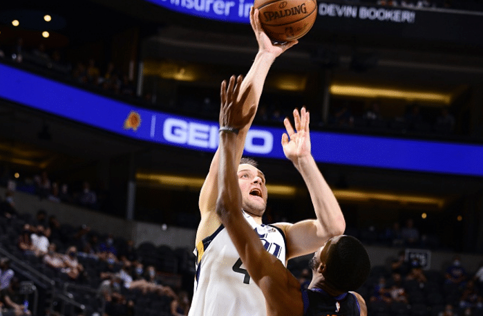 第四节还剩下10.4秒的时候,爵士落后3分,米切尔迎着2个人的防守直接出手三分球命中,帮助球队扳平了比分,而且之后布克的绝杀不中,这个时候的米切尔是绝对的英雄。