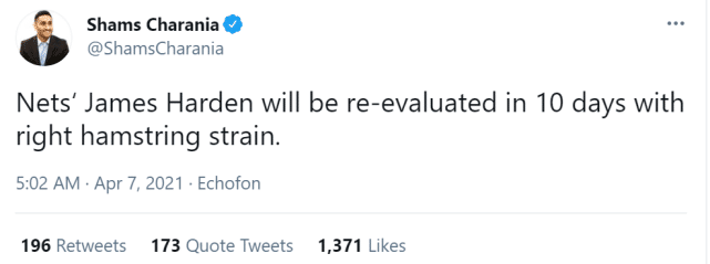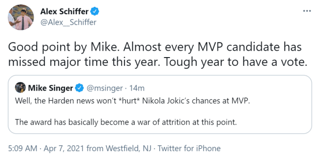 赛季至今,哈登打了42场比赛,场均25.2分8篮板10.9助攻,他刚刚成为MVP的大热门就受伤了。NBA记者Mike Singer写道:“哈登的新闻不会‘伤害’到约基奇当选MVP的几率了。到了这个时候,这一奖项已经成为一场消耗战。”篮网记者Alex Schiffer转发了这一社媒表示赞同:“几乎每个MVP竞争者都缺席过一段时间,很难投票的一年。”