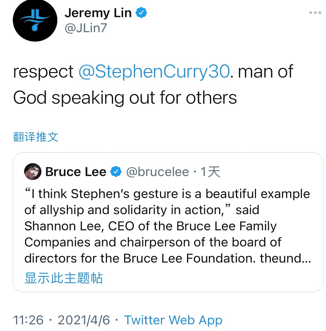 就在4月6日,库里的好友也是华裔球星林书豪在社交媒体上转发,他表示:“向库里致敬,上帝的人替别人说话。”
