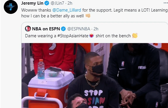 值得一提的是这已经并非林书豪第一次在社交媒体上感谢球员为亚裔发声了,此前林书豪感谢过韦德等人,而利拉德穿着支持亚裔的T恤在场边,引发了很大的轰动,而林书豪也很快表达了自己的谢意。