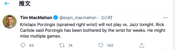 第三件大事来自于波神的伤情更新,据《达拉斯晨报》记者Brad Townsend报道,独行侠方面不确定波尔津吉斯何时能够回归,目前标注是“无限期伤停”主帅卡莱尔在接受采访时表示“波尔津吉斯右手腕扭伤,他已经被手腕伤势困扰了好几星期,他可能会错过多场比赛,我不知道(是否赛季报销)只能等消息”