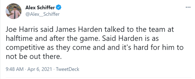 首节4分22秒,哈登助攻哈里斯命中三分后,就走向场边和纳什交流。纳什很快示意场上球员犯规,让哈登下场。阿德很快犯规,哈登返回更衣室接受检查。赛后,纳什说哈登当时感觉自己的腿筋有点不对劲。