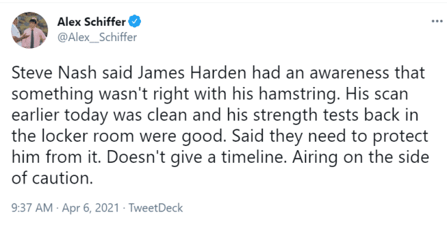 纳什还表示,哈登在复出前一切正常。他在今天早些时候又接受了一次核磁共振检查,检查结果没问题,他在更衣室内的力量训练测试也OK。如今,哈登再次腿筋紧张,篮网会非常谨慎对待。