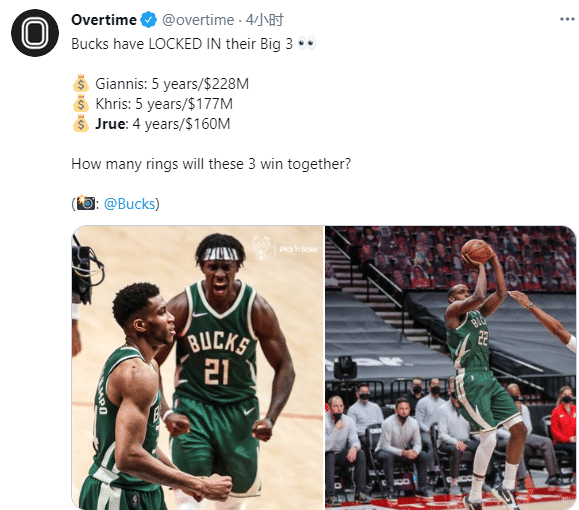 雄鹿阵中将有三名顶薪球员,字母哥、米德尔顿和霍勒迪下赛季总薪资1.05亿美元(预估奢侈税起征线1.37亿美元),22-23赛季1.13亿美元(奢侈税线1.4亿美元),23-24赛季1.21亿美元(奢侈线线1.45亿美元);雄鹿确定三巨头冲冠的核心阵容,冒险打造如此豪阵,未来几年雄鹿还有希望夺冠吗?