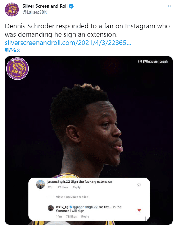 此前施罗德已经两次拒绝湖人提前续约合同——拒绝2年3340万美元的合同,拒绝4年8400万美元大合同;湖人想要提前续约施罗德,但双方一直没有谈妥,现在施罗德的态度就是拒绝提前续约,要等到今夏休赛期,他才会签约。