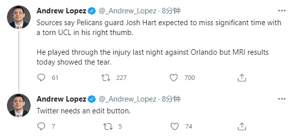 来源:直播车04-03 18:02直播车4月3日讯 鹈鹕遭遇伤病大麻烦,锡安、英格拉姆、鲍尔都在伤病名单上,哈特则是重大伤病,据鹈鹕记者AndrewLopez报道,鹈鹕后卫约什-哈特因遭遇右手拇指副韧带撕裂,预计将长期缺阵,很可能常规赛提前报销。