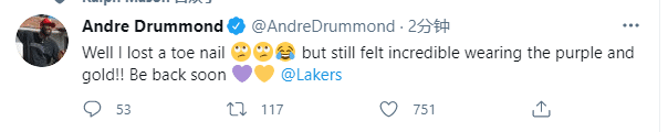 来源:直播车04-02 19:22直播车讯 湖人新援庄神首秀仅打14分钟便受伤离场,湖人记者报道庄神最多伤停1-2场;对于自己的伤情,庄神本人更新社媒媒体,发推写道:好吧,虽然我失去了一个脚指甲(3个哭泣表情),但我依旧对穿着紫金战袍感到不可思议,我很快就会重返赛场。