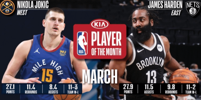 来源:直播车04-02 18:56直播车讯 东西部月最佳球员出来了,西部约基奇当选,东部则是詹姆斯-哈登,场均27.9分11.5助攻9.8篮板,带队战绩11胜2负,这就是哈登在3月份交出的成绩单,所以哈登当选3月份东部月最佳球员没有悬念,与此同时哈登连续创下NBA历史纪录。