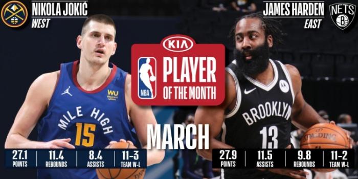 来源:直播车04-02 14:47直播车讯北京时间4月2日,NBA官方公布三月月最佳球员,最终掘金的约基奇和哈登当选,带队的战绩以及个人数据都无可挑剔!