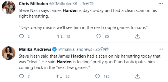 来源:直播车04-02 11:57直播车讯 哈登最新检查结果曝光,篮网主教练纳什透露哈登腿筋伤情,相信哈登很快就能重返赛场。