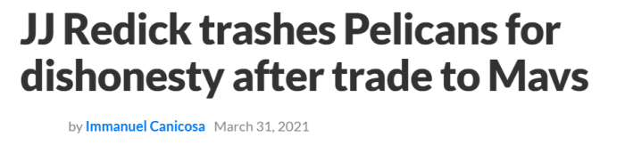 “我很震惊,”雷迪克说道,“那是我没有预料到的。重申一次,这并不是针对达拉斯独行侠,而是我和鹈鹕讨论的去向里从未包括独行侠,所以这有点受伤。”