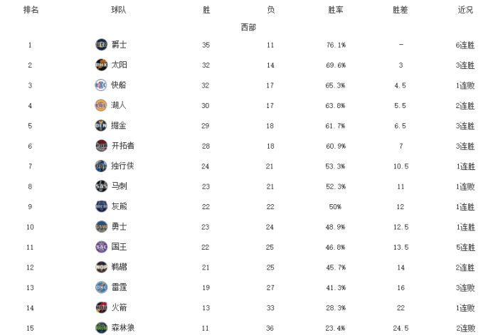 西部9-15名:灰熊、勇士、国王、鹈鹕、雷霆、火箭、森林狼;