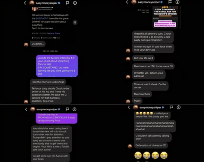 这件事情的起因是在3月30日晚上,知名演员迈克尔-拉帕波特(Michael Rapoport)在社交媒体上更新了数张聊天记录的不同,上面是他和杜兰特之间的骂战,多次用‘ Bit ’ 开头的词汇,而且还有涉及到拉帕波特妻子的言论。这其中杜兰特还希望得知拉帕波特的地址,希望和对方约架。