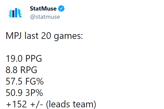 据statmuse统计,自从2月1日以来,贾马尔穆雷场均可以砍下23分5.3助攻,且命中率高达50%,三分命中率45%,罚球命中率91%。赛季至今,他的场均得分、助攻、命中率和三分命中率都创了个人生涯新高!