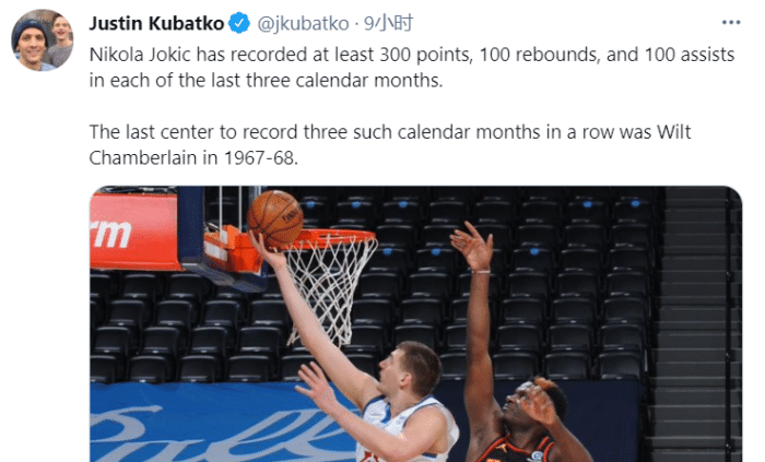 很多人可能没有意识到,其实现在的掘金几乎已经具备了冲冠的所有条件。首先是他们的3大进攻核心,最近一两个月的状态都非常火热!据数据分析师justin统计,最近三个月,约基奇都拿到了至少300分100板100助攻,NBA上一位连续三个月做到这一点的中锋还得追溯到67-68赛季的张伯伦!而今天这一战,约基奇又是14中8高效送出21分10板5助攻,在恩比德和詹姆斯受伤的情况下,约基奇已经成为MVP最有力争夺者之一!
