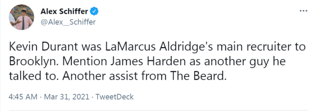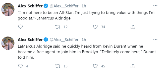 来源:直播车03-31 15:08直播车讯北京时间3月31日,篮网新援阿尔德里奇在加盟后首次接受采访,据他透露,杜兰特和哈登是招募自己的篮网球星,其中,杜兰特招募最积极,而哈登也找他交流过。篮网记者Alex Schiffer调侃道:“这是大胡子送出的又一记助攻。”