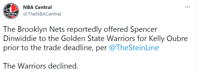 另据名记马克-斯坦恩报道,篮网在交易截止日前曾经和勇士谈过一笔交易,希望用丁威迪来换对方的乌布雷,但勇士拒绝了这笔交易报价。