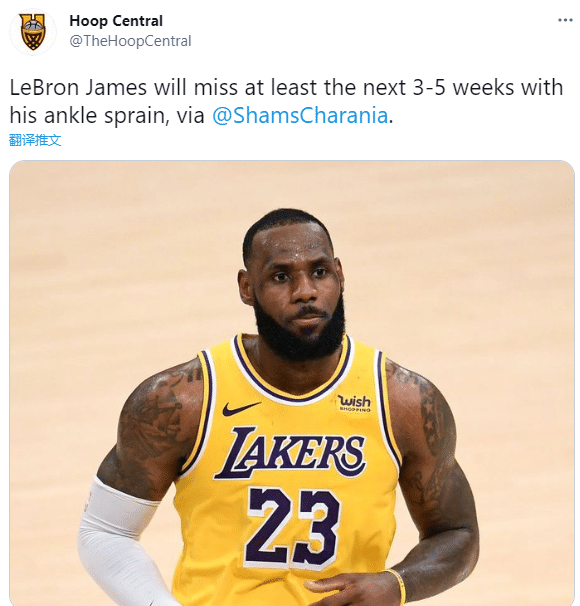 来源:直播车03-31 11:45直播车3月31日讯湖人当家球星勒布朗-詹姆斯伤情更新,名记shams在节目中透露,詹姆斯将会因伤至少再伤停3-5周,在常规赛还剩下6周的情况下,留给詹姆斯备战季后赛的比赛不多了,这意味着詹姆斯有可能被迫提前退出MVP争夺战。