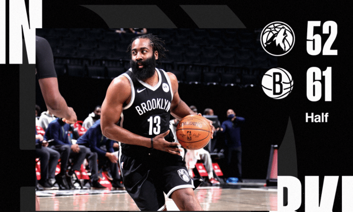 进入第三节,哈登开始发力,连突带投接连造犯规,单节砍下13分3板3助攻,但森林狼也打得非常坚韧,没有让篮网再次拉开分差。决战第四节,两大状元秀唐斯和爱德华兹迎来爆发,凭借两人的连续得分,森林狼在最后时刻拉回悬念,还剩40秒,森林狼错失反超机会,哈登关键两罚全中,比斯利强投三分打铁,欧文罚球杀死比赛!最终篮网主场112比107险胜森林狼取得两连胜!