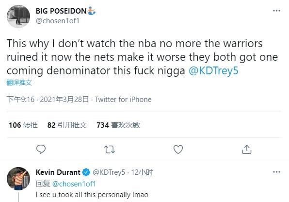一位网友发推写道:“@杜兰特,不要在网上回复那些负能量的帖子了,能不能给你真正的球迷送上几双球鞋和一件签名球衣?另外,篮网总冠军。”然后这位网友就直接被拉黑了,不仅如此杜兰特还发了一段暴躁老哥怼人的视频回应他。