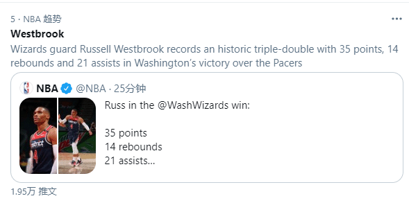 韦少轰下35+20+10超级三双,成为NBA历史上第一位拿到如此恐怖数据的球员,仅打38场便轰下奇才生涯第16次三双,成为奇才队史第一人,比肩魔术师和大O成历史第三位轰下30+20+10的球员,;随后韦少冲上热搜引热议,美媒纷纷盛赞韦少是野兽,奇才官方嘲讽质疑声:你们都是韦少过气了。
