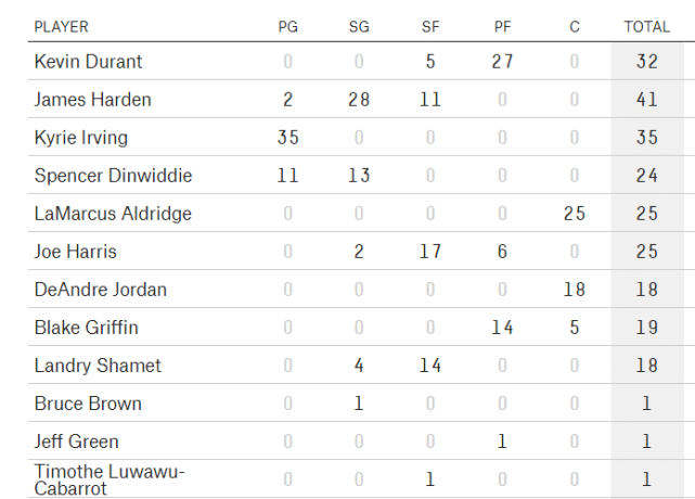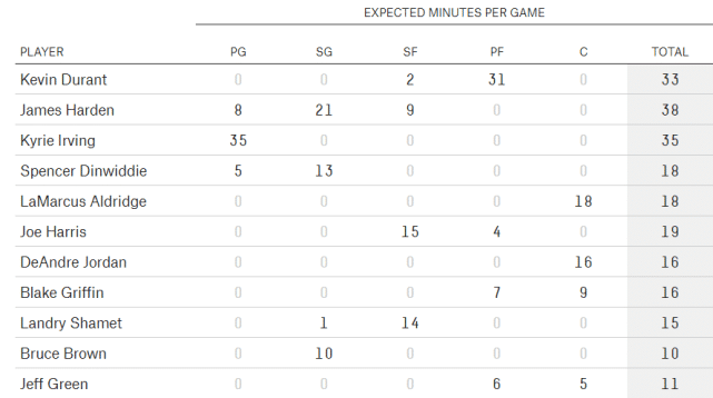 根据美媒这份预测,常规赛场均出场超过30分钟的球员是哈登(38分钟)、杜兰特(33分钟)和欧文(35分钟),此外,哈里斯(19分钟)、丁威迪(18分钟)、阿尔德里奇(18分钟)、小乔丹(16分钟)、格里芬(16分钟)、沙梅特(15分钟)、格林(11分钟)、卡巴罗特(11分钟)、布朗(10分钟)。其中,丁威迪一旦如预计那样赛季报销,他的18分钟可以分配给其他球员。哈里斯、格林、阿德、格里芬都有可能得到更长的出场时间。篮网有足够的深度打11人轮换。