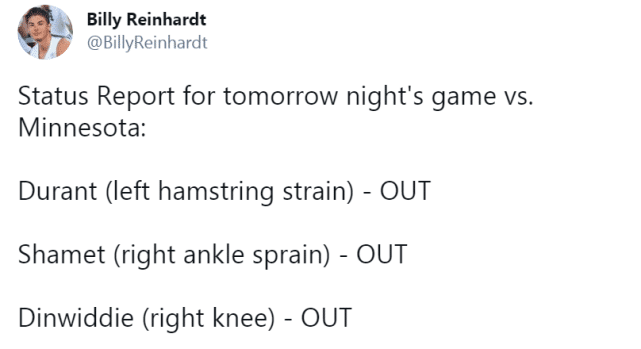 来源:直播车03-29 16:05直播车讯 北京时间3月29日,篮网队安排了一次训练,备战明天主场对森林狼的比赛。篮网官方也公布了明天的伤病名单,三人确定缺席:杜兰特(左腿筋拉伤)、沙梅特(右踝扭伤)和丁威迪(右膝伤病)。