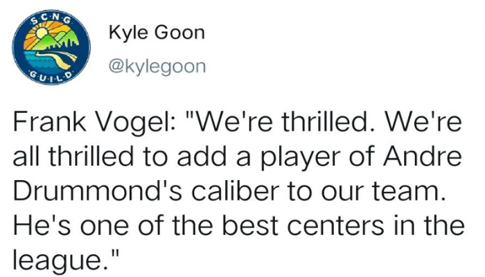 库兹马调侃到“庄神来了,我就多了一个和我抢篮板的对手了。”不过很快库兹马表示“我们得到了一名强援,很开心他能够加入到我们的球队当中。我从午睡中醒来,看到他加盟了我们球队的信息,有他在真好,让他加入到我们当中,看看他能够给我们带来什么。”
